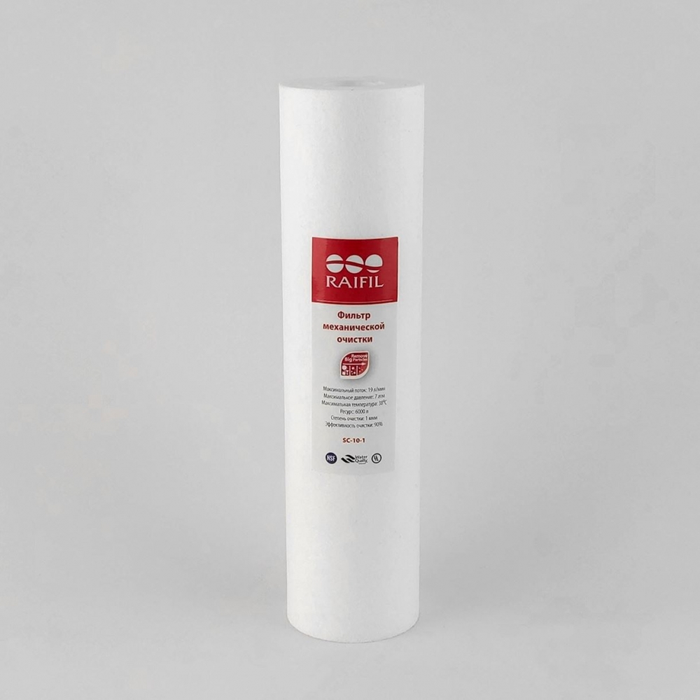 Картридж механічної очистки Raifil SC-10-1 - якісний універсальний змінний фільтруючий елемент виготовлений з поліпропілену, стійкого до біологічного забруднення. Видаляє окислене залізо (іржу), частки мулу, глини, пісок, мікроорганізми, волокно торфу та інші домішки органічного і неорганічного походження, що містяться у водопровідній або джерельній воді. Відфільтрована через такий картридж вода ідеально підходить для очищення питної води, охороняє сантехніку, побутове і промислове обладнання від всіх типів нерозчинних механічних забруднень.