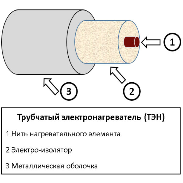 ТЭН - трубчатый электронагреватель - электронагревательный прибор в виде металлической трубки, заполненной теплопроводящим электрическим изолятором. Точно по центру изолятора проходит токопроводящая нить (обычно нихромовая или фехралевая) определённого сопротивления для передачи необходимой удельной мощности на поверхность ТЭН.